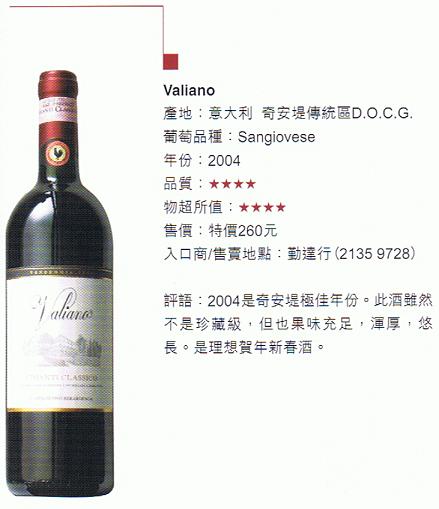 百年老號 PICCINI 旗下品牌 Valiano 的奇安提傳統區 (Chianti Classico)得到 酒經月刊零八年二月 平靚正推介。